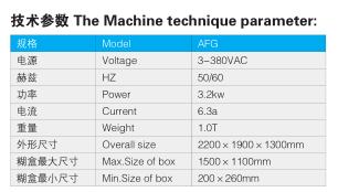 解除了紙箱廠在一些季節紙箱容易開膠的難題。本機由于采用手工收折,在提高工作效率的同時還適用于全自動機不好加工的壓痕線不正、特殊異型與紙面有開窗的制品。